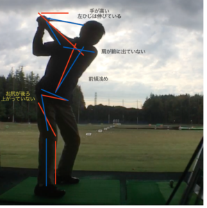 私は、さらに、左ひじが曲がってしまって、シャフトはクロス(飛球線方向より右を向く)気味だ。これは、肩関節の柔軟性の問題だろう。